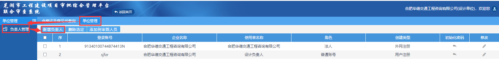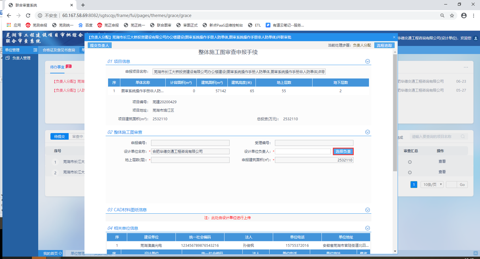 点击上图中的负责人分配待办,弹出如下图页面,需要选择设计负责人。点击“单位管理—负责人管理—新增负责人”按钮可以维护单位负责人信息