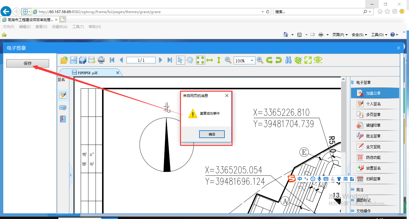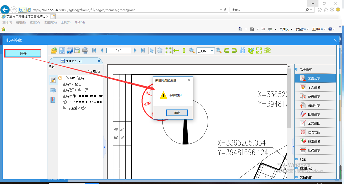 5、左击鼠标会出现签章成功提示,点击确认后对签章进行“保存”即可