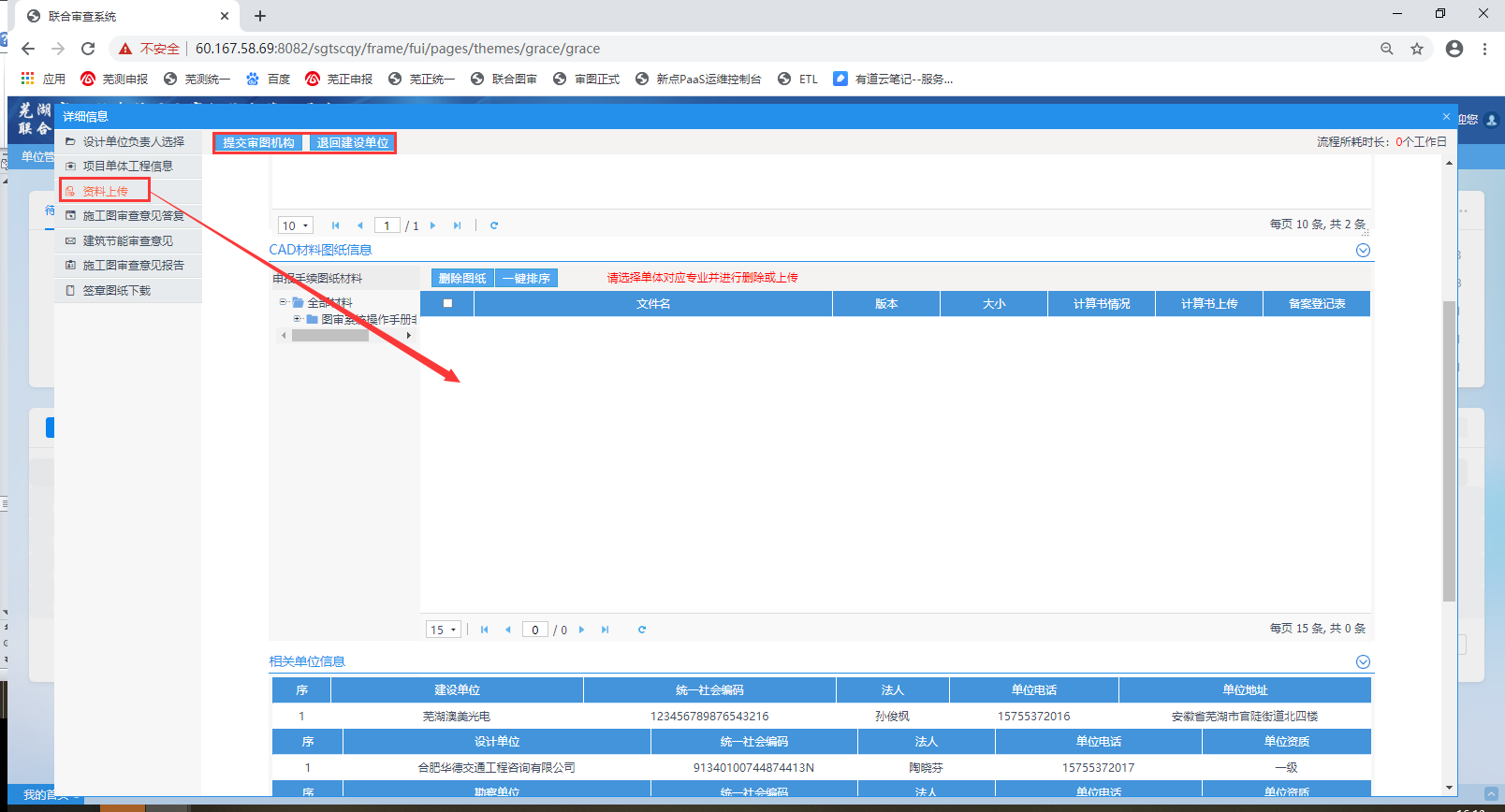 也可以在控制台资料上传页面进行选择审图机构、设计人员信息录入、图纸上传、相关单位信息确认、提交图审或退回操作。如下图: