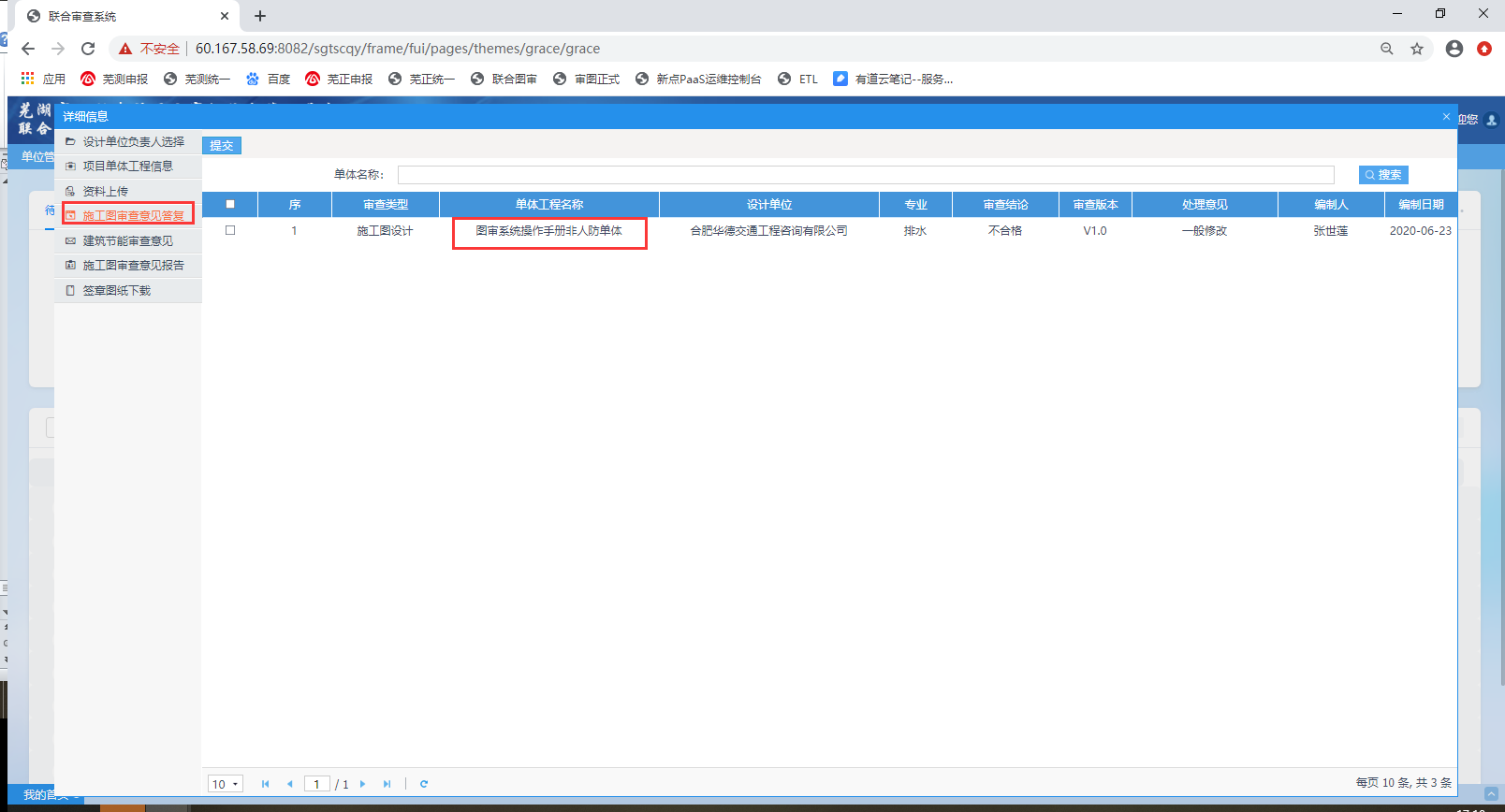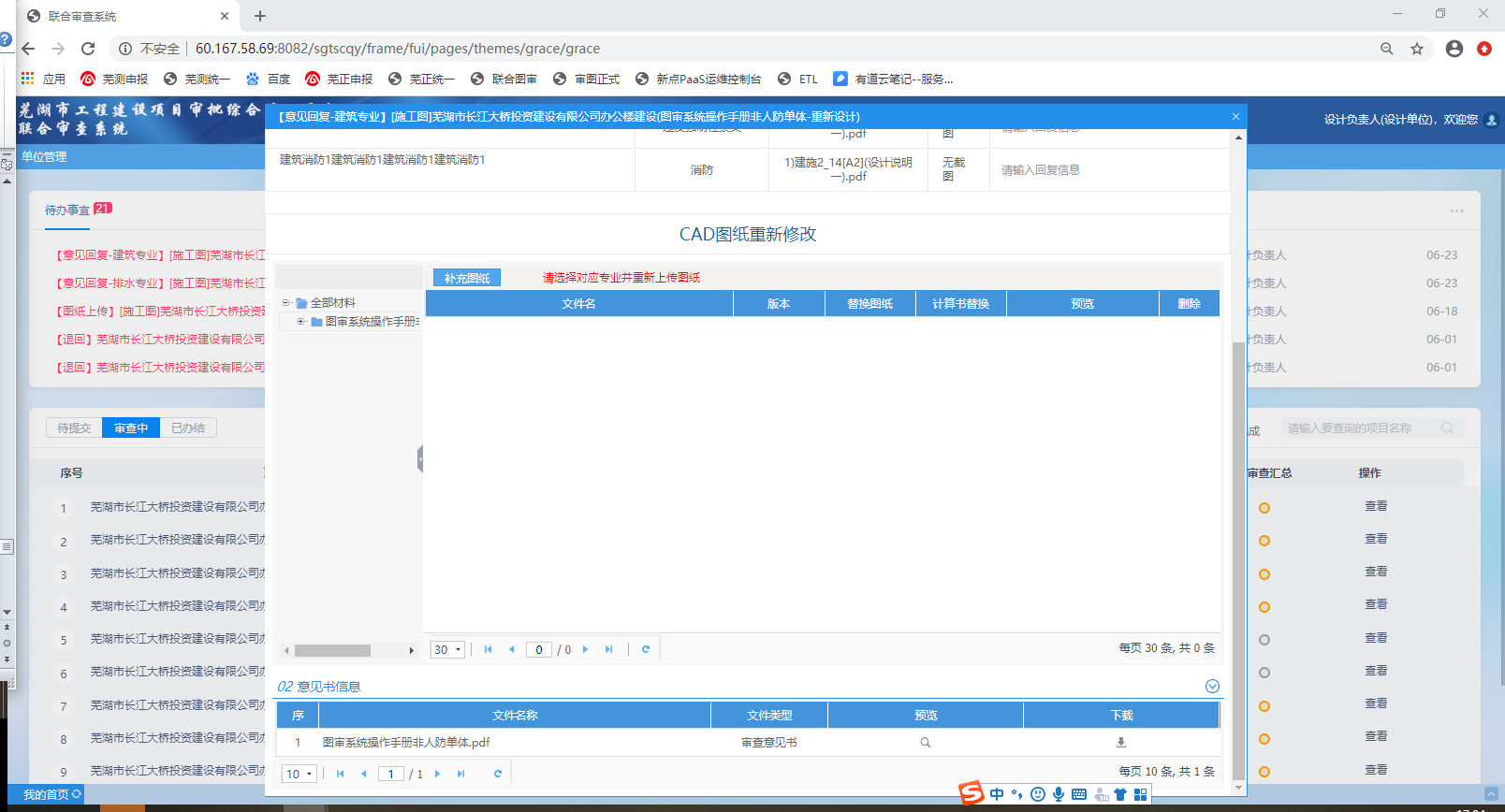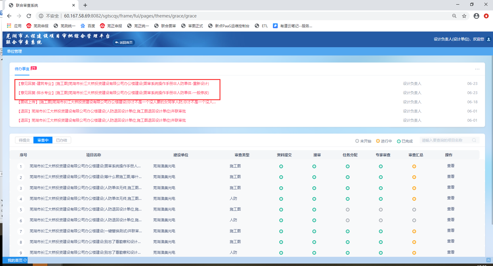 图审人员对图纸审核完成后,如果存在图纸不通过,退回到设计单位进行图纸修改。设计单位项目负责人登录系统,在首页代办中会自动显示意见回复。如下图: