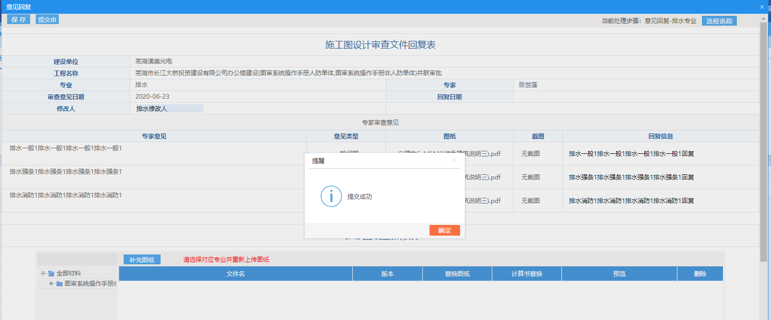 进入意见回复页面,填写答复信息、替换图纸等操作完成后,点击提交申请即可