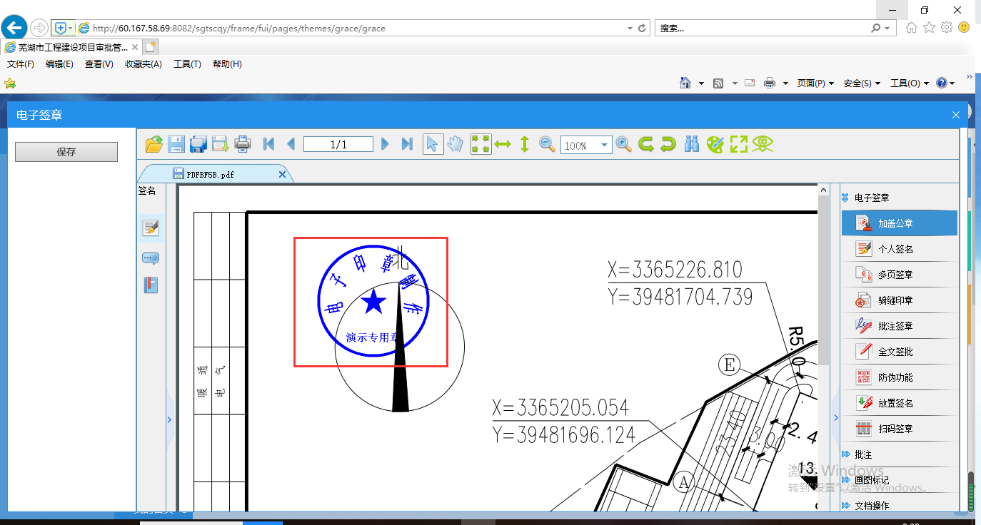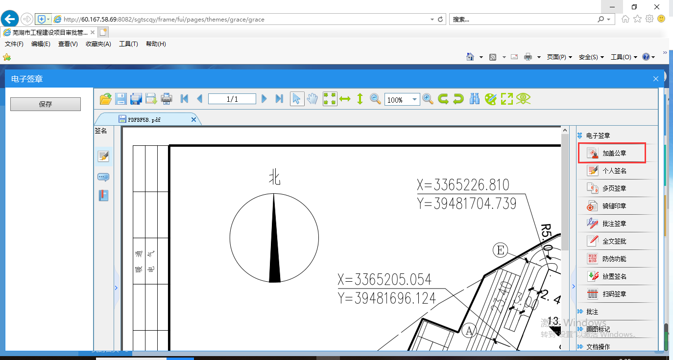 2、进入图纸签章页面,点击“加盖公章”按钮