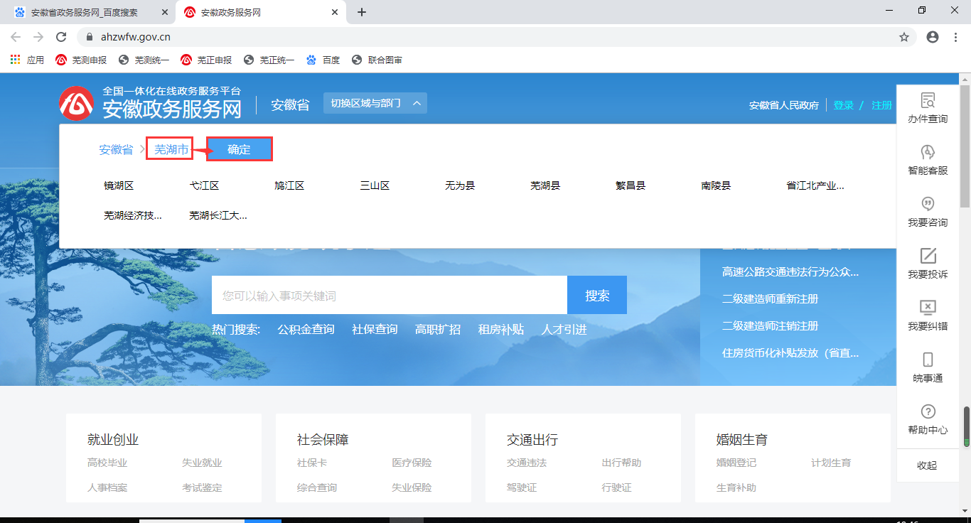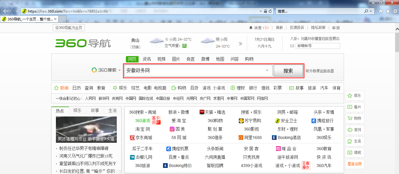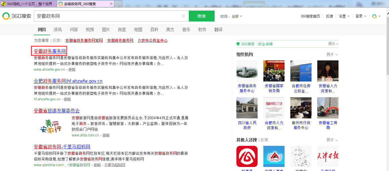 打开IE浏览器,在浏览器搜索框中输入安徽政务服务网后,点击搜索按钮,如下图: