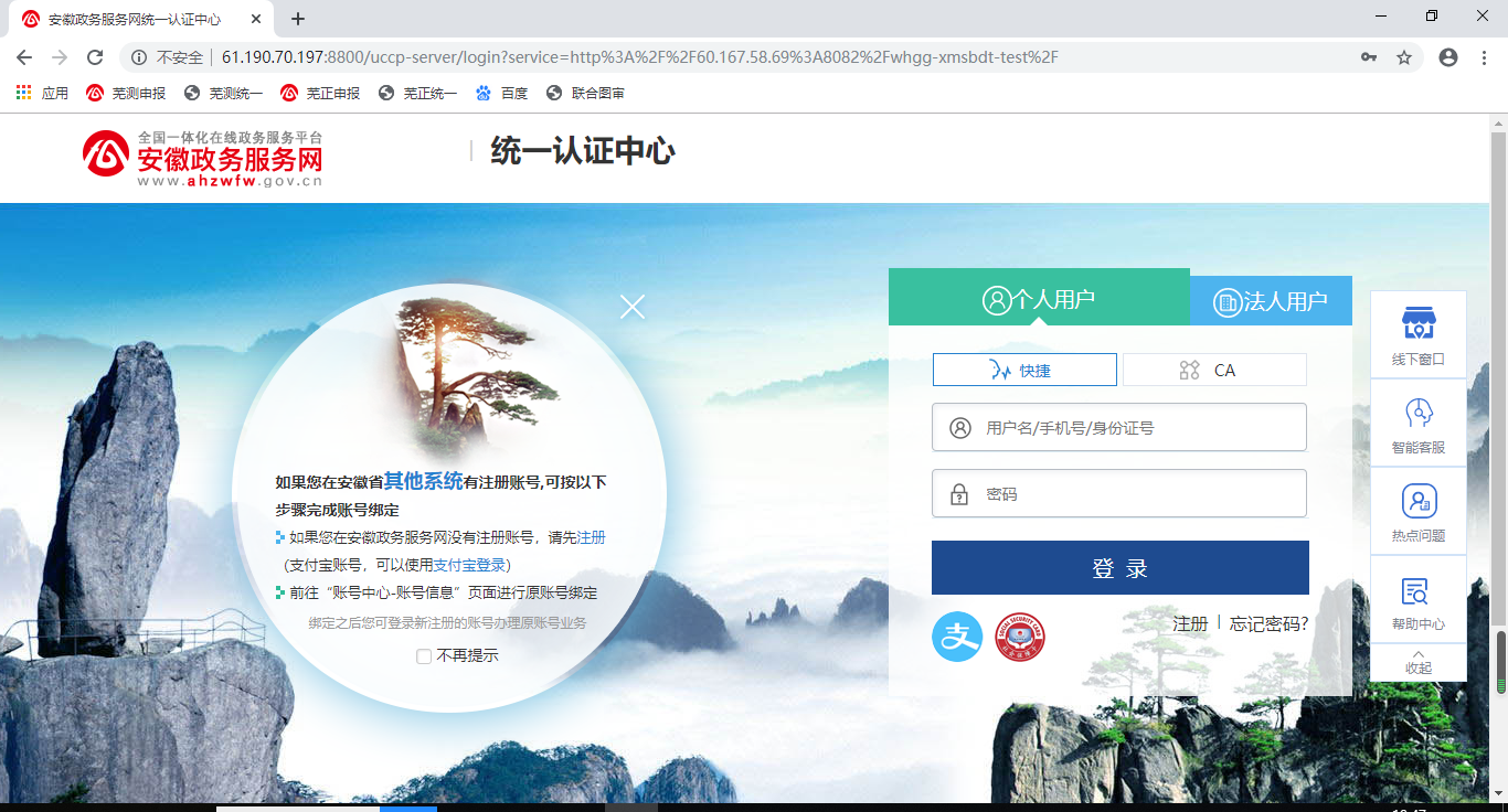 点击上图中登录按钮后,会弹出如下图“统一认证中心”界面,选择法人用户输入账号密码后点击登录。 ?
