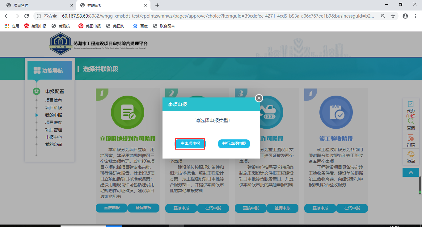 点击直接申报按钮后,页面弹出事项申报选择对话框,选择主事项申报,如下图: