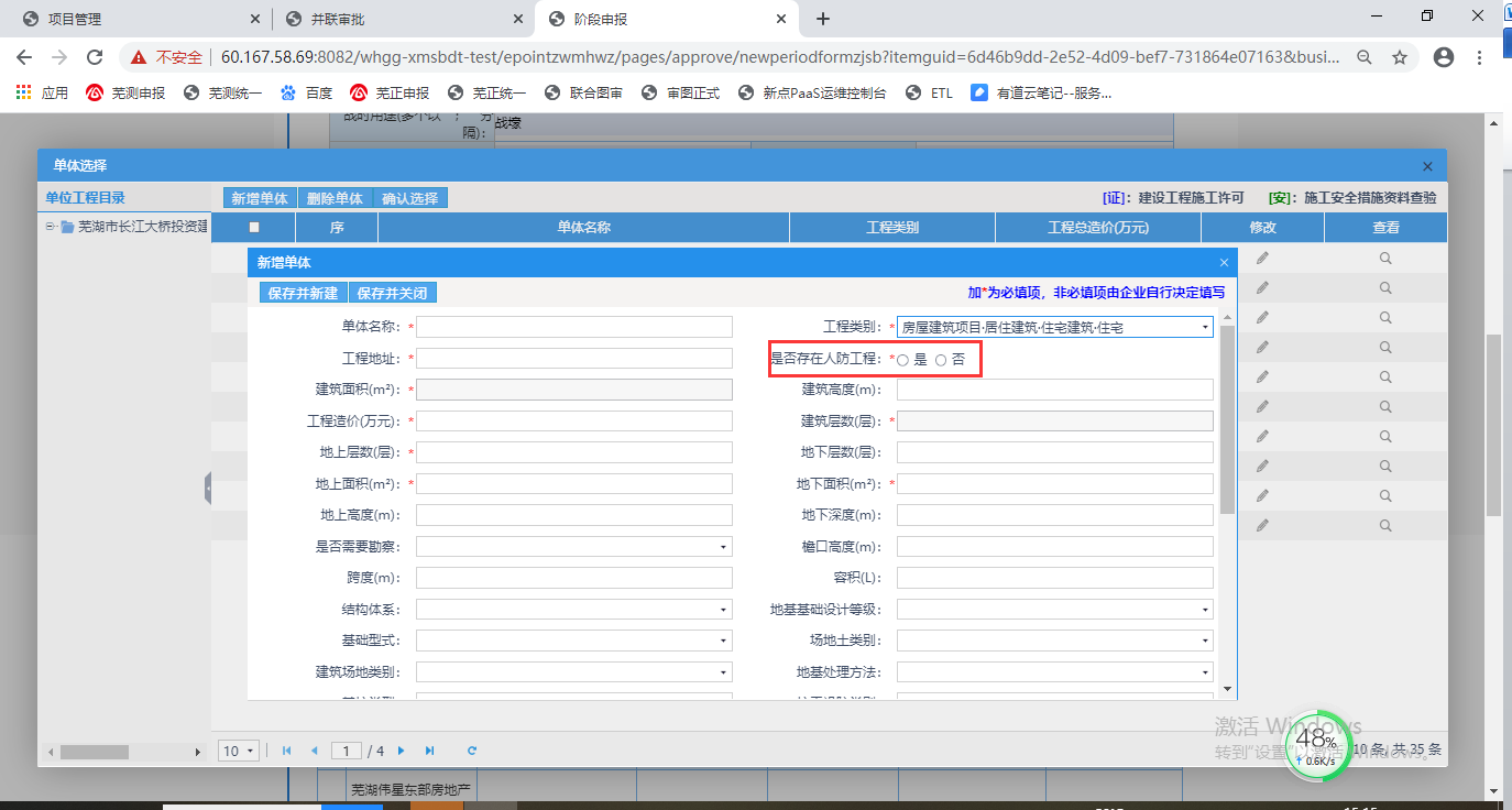 “是否存在人防工程”字段,若选是,则为人防单体;若选否,则为非人防单体。若表单中“是否涉及人防”选择是,则此处至少需要两个单体(人防单体和非人防单体)