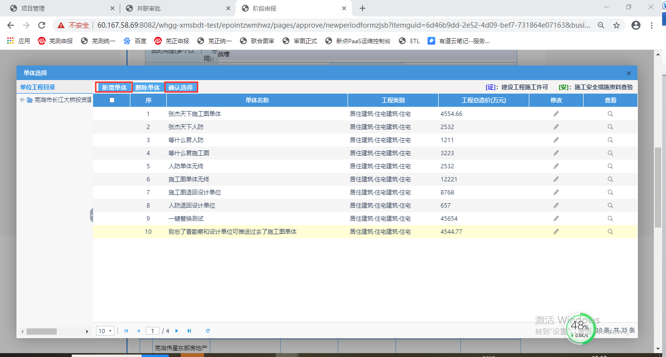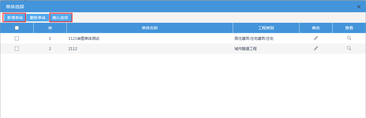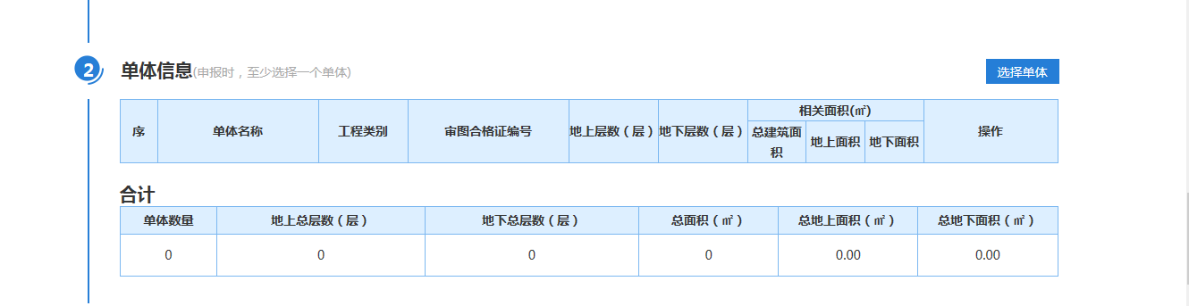 如果缺少对应单体需要点击下图中的【新增单体】按钮,新增单体相关信息,如果有单体数据勾选本次申报的单体,勾选后点击【确认选择】