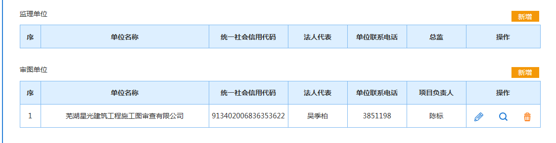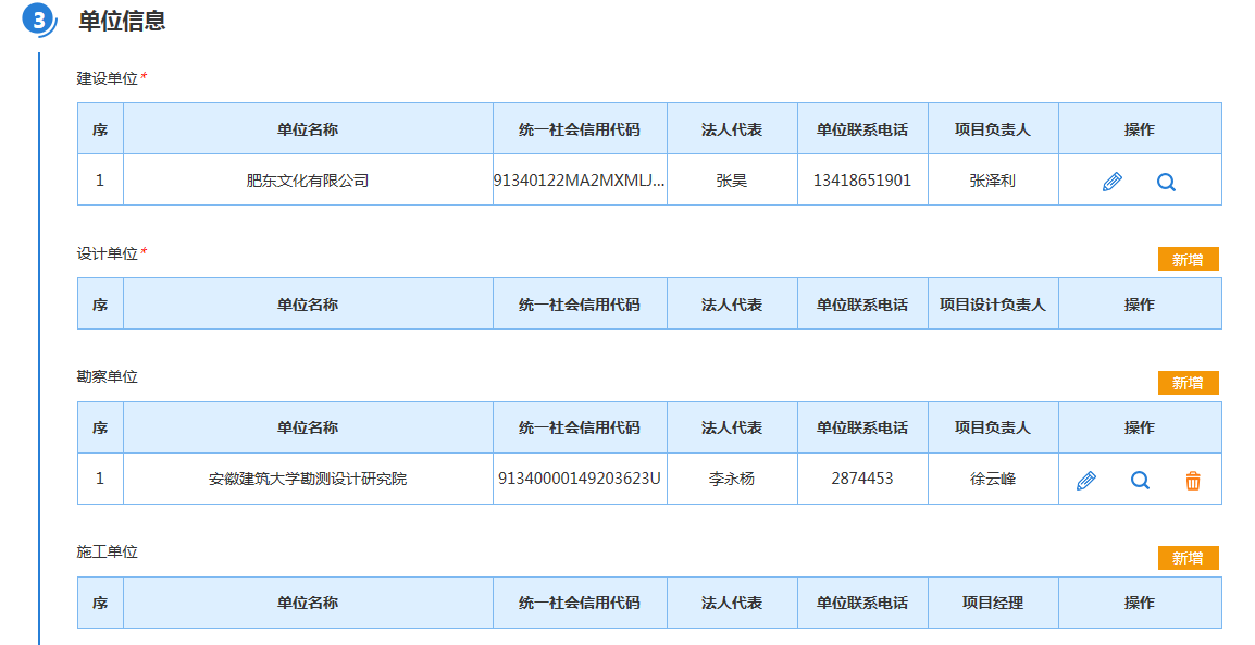 上图中的单位信息填写,建设单位直接点击列表中的修改按钮,完善建设单位中的相关信息及人员信息。其他单位点击单位列表右上角的【新增】按钮,选择基础库中的企业及相关人员。