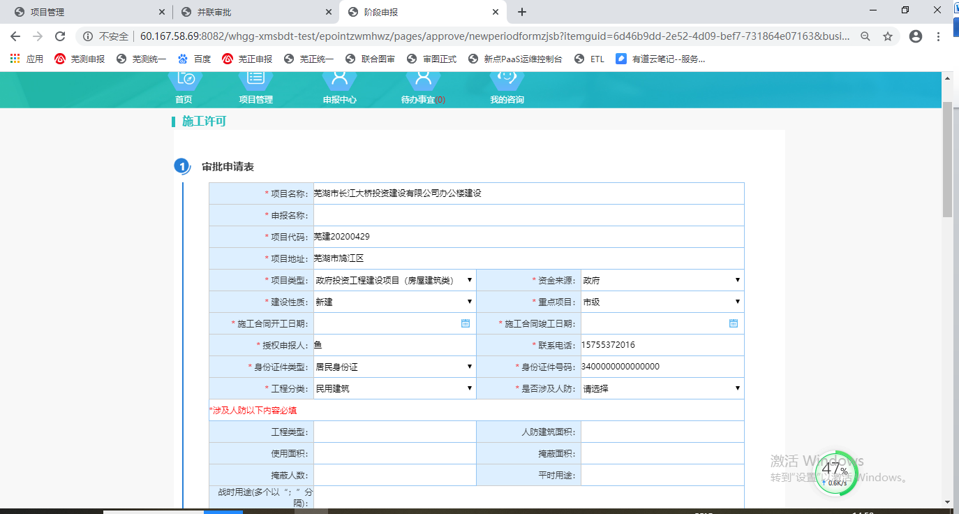 点击项目管理,选择要申报的项目(若未获取项目信息则点击页面左上角的“获取项目”按钮,输入发改投资在线监管平台项目信息,如果是不需要发改委备案的装修项目则点击右上角的“新增项目”按钮。)在项目阶段中选择施工许可阶段进行申报,项目的申报分为直接申报和征询申报两种申报模式。