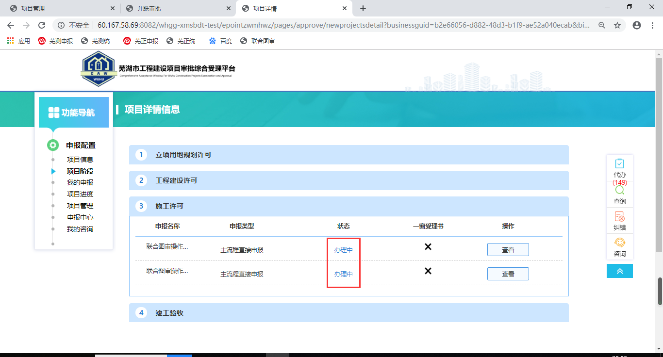 建设单位对图审申报完成后,可以在阶段列表中查看到状态,点击查看可以查看到具体的办理状态。